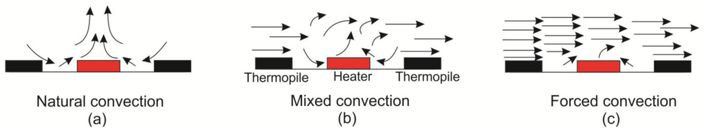 MDF is basically influenced by natural (free) convection and thermal noise in the case of thermal flow sensors. Natural convection is a complex mechanism in which the fluid motion is generated by density differences in the fluid due to temperature gradients [4]. The air surrounding the sensor heater receives heat, expands and rises up. The cooler air subsequently moves to replace it. This cooler air is then heated and the process continues, forming convection current. Thermal noise is an electrical noise source caused by random motion of electrical charges in the material.