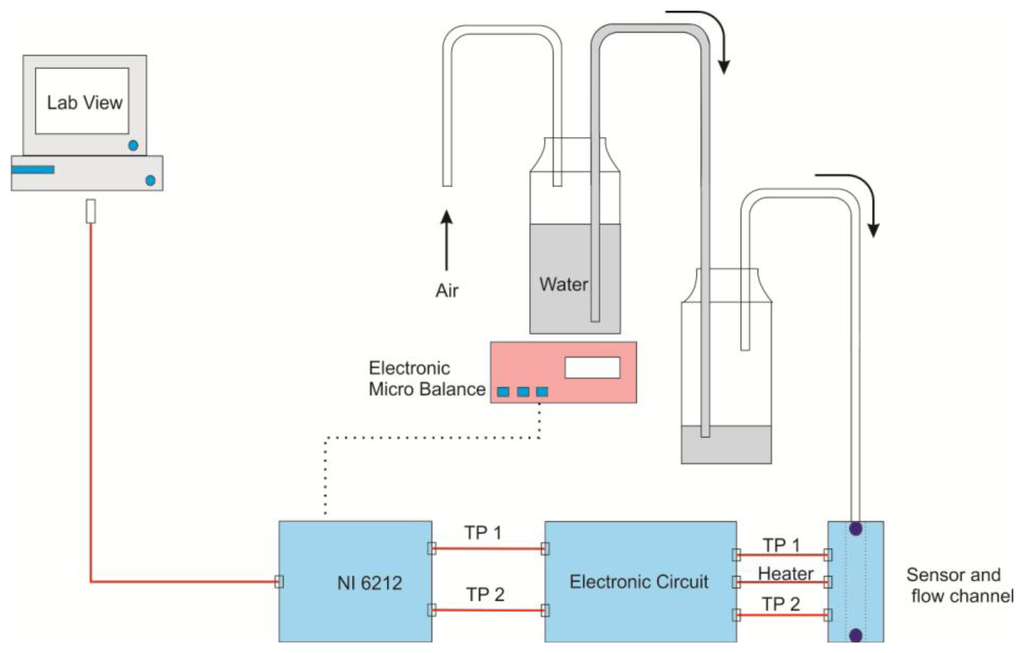 In order to measure the sensor MDF, we built a physical method which generates very small flow rates. The method principle is based on weighing the mass changes of one bottle partially filled with water during its discharge into another bottle. Mass readings were taken in time steps of 2.5 s in order to calculate the mass flow. Water flow between the two bottles occurs by means of a small pipe. This method is shown in Figure 3. In the experiments, we initiate a water flow between two bottles, placed in different height positions, by pushing air into the first bottle. This action forces an equivalent air flow to go out from the second bottle. The generated air flow is guided through a pipe to the sensor air-channel. The first bottle is placed on an electronic microbalance (readability 0.1 mg, Sartorius, Göttingen, Germany) interfaced to a computer through DAQ NI 6212 device. Balance readings are synchronized with the sensor output voltage difference through the program LabVIEW. As initial conditions, the first bottle is half full with water and the second one is empty. Then we consider three different cases regarding the height positions of the two bottles. In such a way their height differences are large, moderate and small respectively. In the first two cases, the first bottle is discharged completely into the second one, but at different speeds, whereas in the third case, water starts to flow slowly between the two bottles until equilibrium is reached. This happens when the two bottles have the same water level.