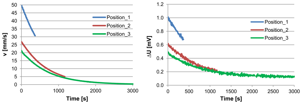 The discharging curve in the previous experiments is exponential as shown in Figure 4. This figure compares the equivalent air velocity (left) and the related sensor output voltage difference (right) vs. time. The flow decreases very slowly toward zero. The equivalent air velocity is calculated at 20 °C by assuming that the water density is 998.2 kg/m3, and the section area of the air channel is 3 mm2. The resulting curve of velocity (v) as function of time has similar behavior of the sensor output voltage difference (∆U) as function of time. In order to obtain the direct relationship between the sensor output voltage difference and air velocity, we modeled the both curves by using MATLAB based program. The resultant fitted curves for the air velocity (in mm/s) and the sensor output voltage difference (in mV), are given in the following expressions, respectively: