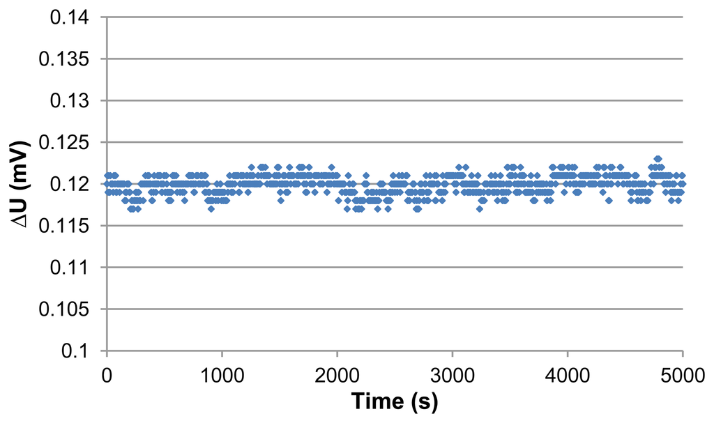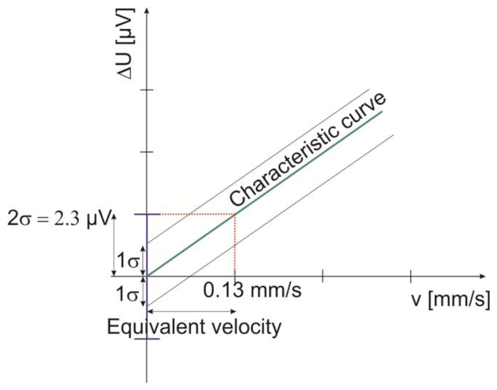 The relative error by this method is less than 20% for the range from 0 to 5 mm/s; it decreases significantly afterwards to less than 10% for the range 5 to 20 mm/s. The larger relative errors for small velocities are due to the high significance of the free convection in heat transfer in addition to the instability of the balance at low values which is another reason for these relatively high errors. By extracting the maximum deviation from the fitting line we found that the maximum error is about 0.03 mV. The corresponding error in velocity according to Equation (6) is about 1.8 mm/s. This MDF result is in the same order as the results found in the previously mentioned reports [6,7]. However, it is higher than the one mentioned in [10] where a different sensor principle is used. Eliminating the error caused by the balance in the previous method is possible by evaluating the sensor noise at zero flow where the natural convection is maximum. This can be done by doing second experiment without flow.