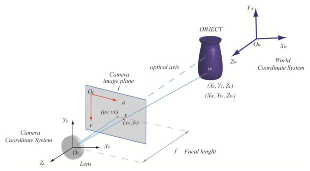 The pinhole camera model is used to describe the geometry of the optical devices. Considering the perspective projection of an object point w (Figure 1) with coordinates Xc = [Xc, Yc, Zc]T in the camera coordinate system onto the image plane I with coordinates x = [xu, yu]T we have: