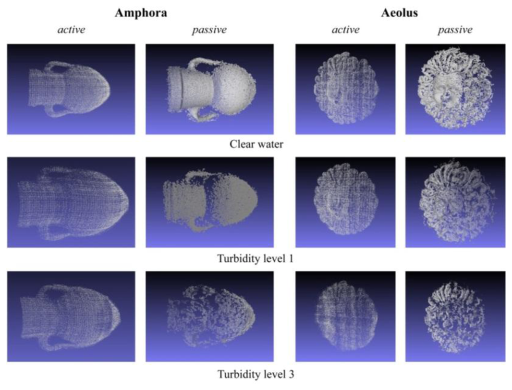 Moreover, it is important to analyse the percentage of points deleted during the preliminary editing procedure. The percentage values of deleted points (Npc% and Nac%) reported in Table 3 show that the active stereo technique is more affected by scattering, even under low turbidity conditions. Therefore, a time-consuming process is needed to manually delete the 3D points before using the noise filter, which works only on points that are very close to the object surface. The passive technique requires a lower noise reduction, but the scattering effect causes a loss of image contrast that compromises the matching of correspondent points and may generate holes in the reconstructed point clouds.