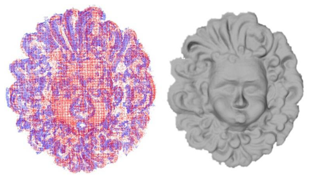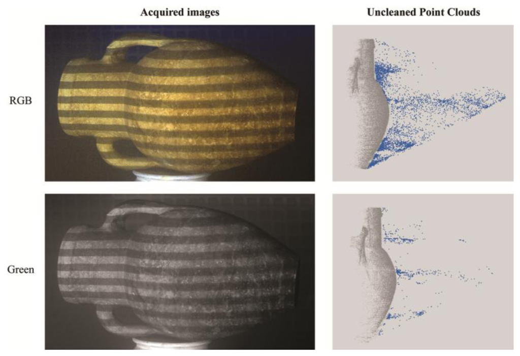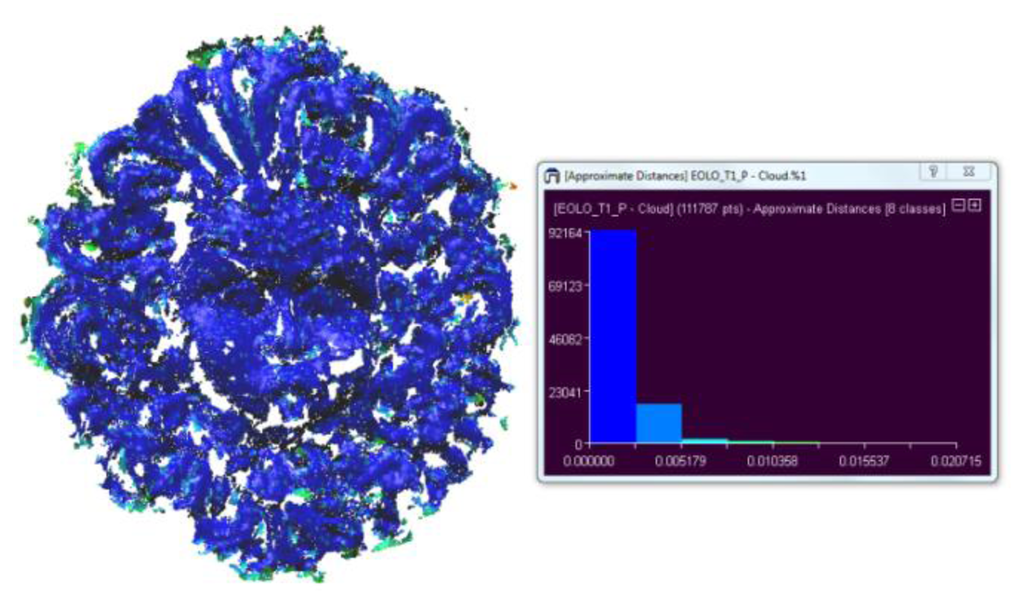 The point clouds computed through the active and passive techniques must be further elaborated to obtain the final 3D models, because many outlier points are present. Rapidform® software has been used to edit the point clouds, while we used the open source software Cloud Compare [39] to perform measurements and comparisons on the 3D data. In this analysis, we aim to quantify the performance of both techniques by computing the density of 3D points, the percentage of outliers and the accuracy for the two objects. Moreover, a multi-channel analysis has been performed to evaluate the quality of 3D reconstructions by elaborating the images separately in each of the three colour channels.