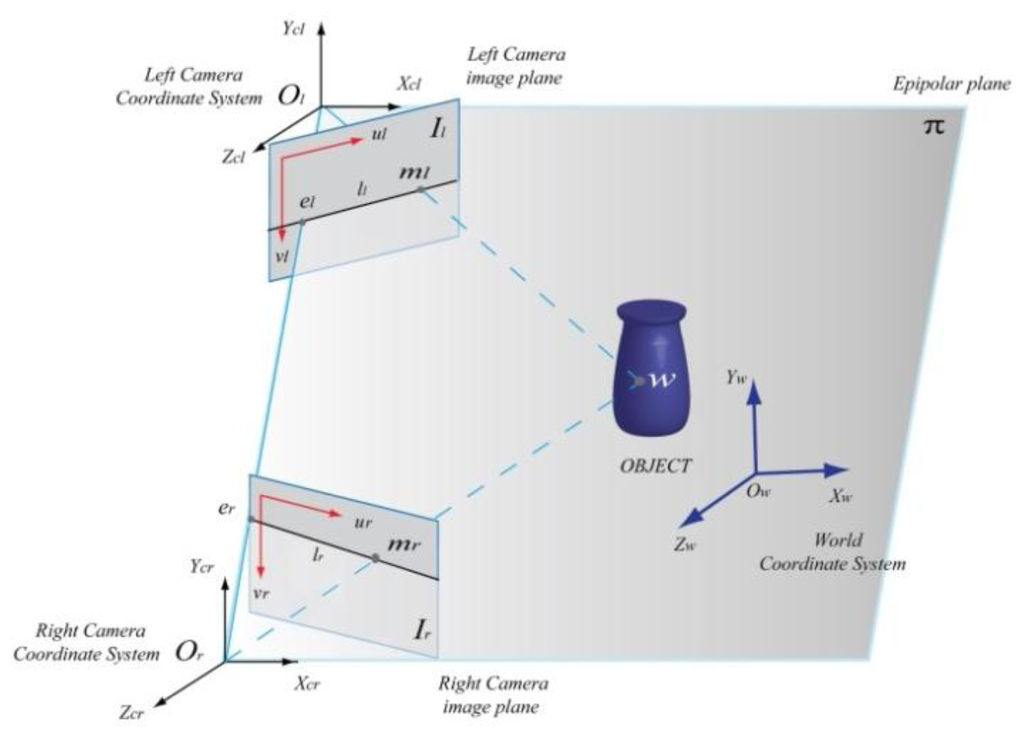Given a point ml in the left image, the correspondent point mr in the right image is constrained to lie on the epipolar line (epipolar constraint). Using the perspective projection theory (see Equation (3)), the coordinates of the correspondent points ml and mr can be defined through the relations [31]: