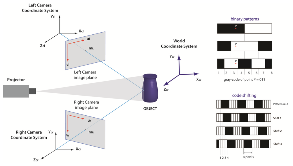 A different approach involves the projection of a sequence of structured-light patterns in order to codify the scene to be acquired. In this way, the matching of the points is performed automatically, because each point object is uniquely determined by an assigned code [27]. This technique will be described in detail in the next section.