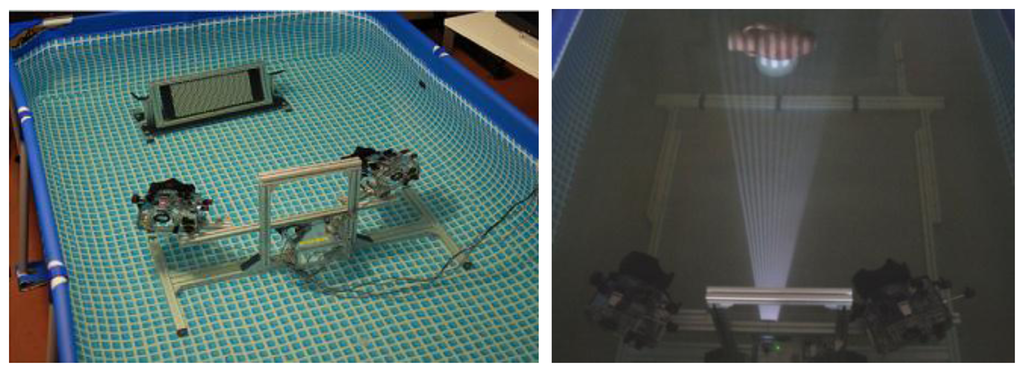 Two Nikon D200 cameras, with a Charge Coupled Device (CCD) sensor size of 23.6 × 15.8 mm and a resolution of 3,872 × 2,592 pixels, equipped with an AF-Nikkor 35 mm lens, have been used to acquire the scene. The projector used in our experimentation is a Mitsubishi PK20, characterized by a very small size (123 × 48 × 97 mm), an acceptable resolution of 800 × 600 pixels with a brightness of 25 lumens and a low power consumption that allows for the use of a battery pack as power source. The three optical devices are protected by acrylic waterproof housings and fixed on an aluminium support; the optical setup is depicted in Figure 4. A dome port is mounted on the camera housing to reduce the refractive effects at the air-water interface [36].