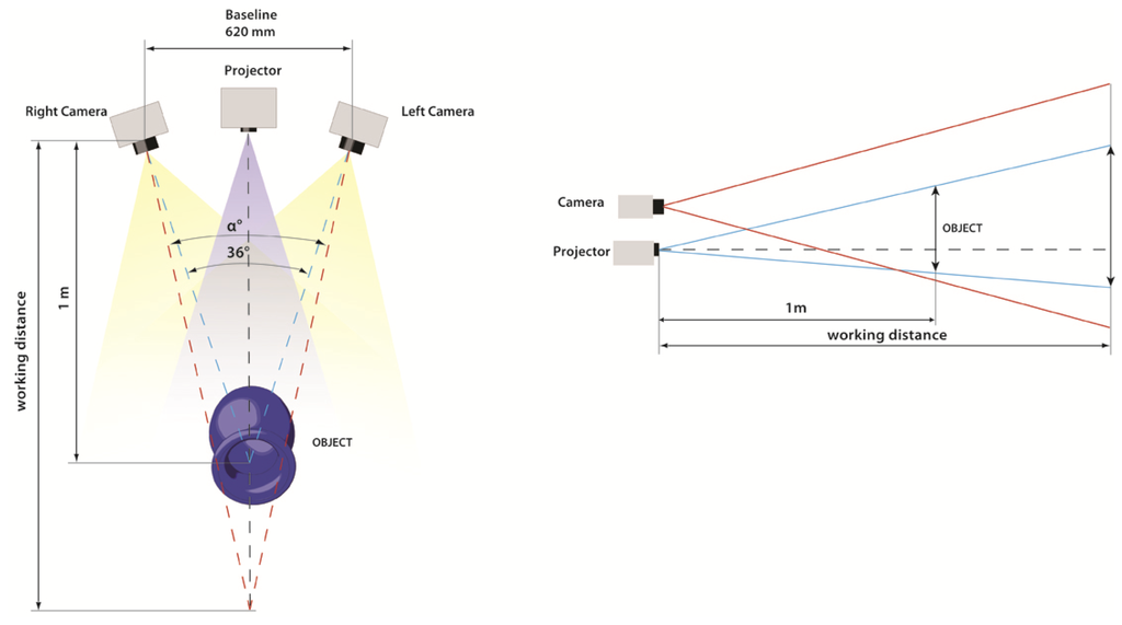 The system dimensions are 950 × 530 × 560 mm, with a weight of about 17 kg in air. The two cameras are mounted on the same bar, in order to have a 620 mm baseline (the distance between the optical centres of the cameras) and a 36 degrees angle between the optical axes. The projector is fixed on an independent bar in a lower position, in order to take into account the differences between the Fields-Of-View (FOVs) of the cameras and the projector (Figure 5). The latter generates an oblique off-axis projection, while the cameras present a symmetric FOV with respect to the optical axis. We chose this setup in order to allow for the acquisition of an object of 30–40 cm at a working distance of 1 m, maintaining a reduced scattering volume due to the overlap of the FOVs of the imaging devices.