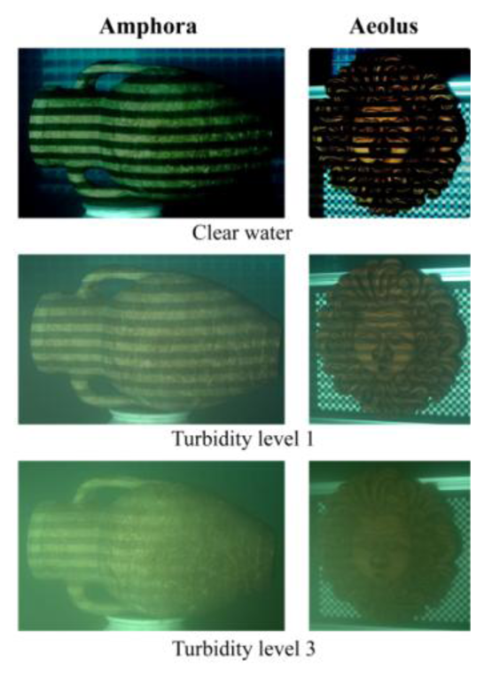 By comparing the results in clear water of Table 5, Table 6 and Table 7, it is apparent that the accuracy of the 3D reconstruction for both the techniques depends on the object shape; in particular, it increases considering a planar surface, a regular curved surface (Amphora) and an irregular surface (Aeolus).