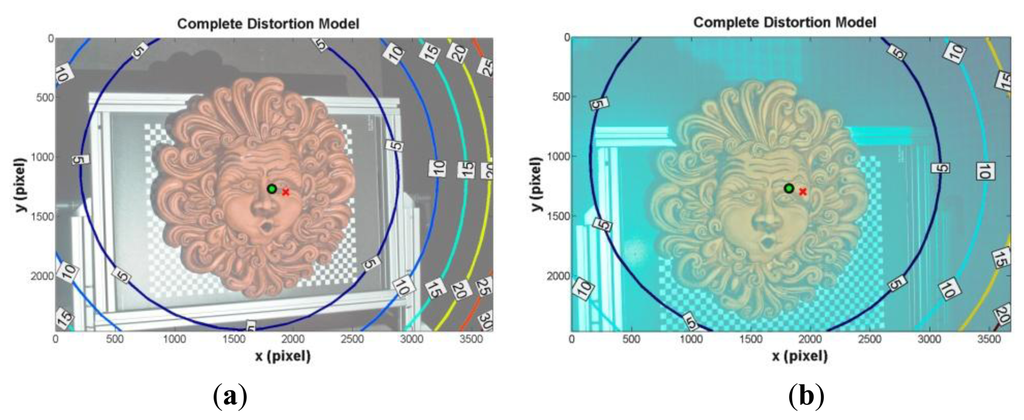 The system has been first calibrated using the RAW camera files, extracting de-mosaicked grey scale images. The comparison between calibration parameters in air and water (Table 2) shows that the acrylic interface affects only the principal point coordinates that differ by 1 mm and 0.5 mm in the x and y directions, respectively, while focal length variation is equal to just 0.37 mm. This is due to a non-perfect alignment between the optical axes of camera lens and dome port, and to asymmetric components like the dome port shape. The comparison between the values in air and in water shows a difference on the focal length due to the refractive effect of 4.87 mm, which corresponds to an increase of about 13%. This variation of focal length implies a decrease of the FOV proportional to the medium index, because the CCD size is constant. Finally, the analysis of the principal point coordinates shows negligible variations. The complete distortion model, defined as the sum of radial and tangential components for each camera as depicted in Figure 7, shows the displacement of the principal point with respect to the image centre in x and y directions. The maps of optical distortions show that deviations are very small in the image centre where the object to be captured is located (maximum deviation at object border of about three pixels).