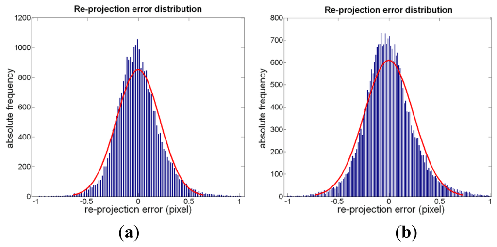 To evaluate the reliability of the underwater calibration, we considered the re-projection error for each corner point of the calibration checkerboard, defined as the distance between the points of the actual image, and those computed from the back projection of the ideal checkerboard. The error dispersions are Gaussian-distributed and the values of mean and standard deviation obtained in water, computed on both x and y directions, are comparable with the ones obtained in air (see Figure 8). This comparison allows us to consider that the assumed linear model of calibration in air can be used also in water, without taking into account the refraction effects.