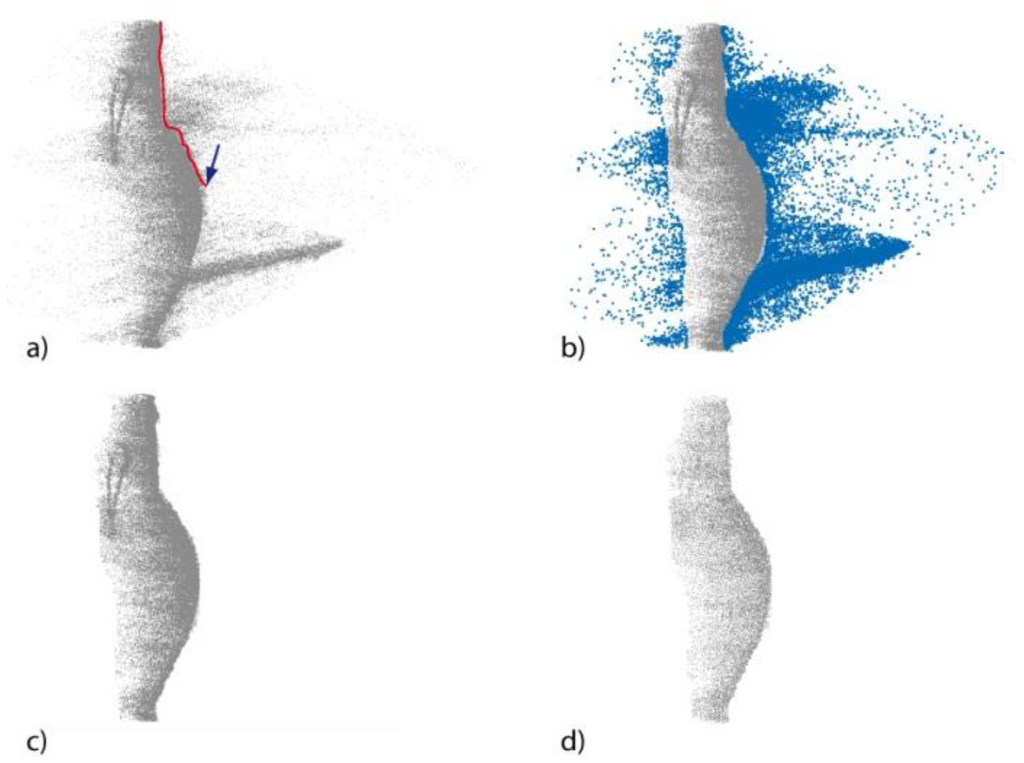 The first step consists in the manual deletion of outlier points that do not belong to the object surface (Figure 9a–c). This is the most time-consuming process, as it is highly dependent upon the surface complexity of the object to be processed. Whereas for a simple object, such as the amphora, only few steps with the lasso selection tool are required, a more complex surface requires manual and accurate intervention. In particular, once that a view of the 3D point cloud is chosen, a cursor is moved with the mouse on the screen to sketch a lasso (an arbitrary closed line) that allows for selecting a group of 3D points. The second cleaning step is the application of the noise filtering functions implemented in the software (Figure 9d), that delete automatically the noisy points close to the object surface. Figure 10 shows the points clouds acquired in different turbidity conditions with both the techniques after the editing procedure.