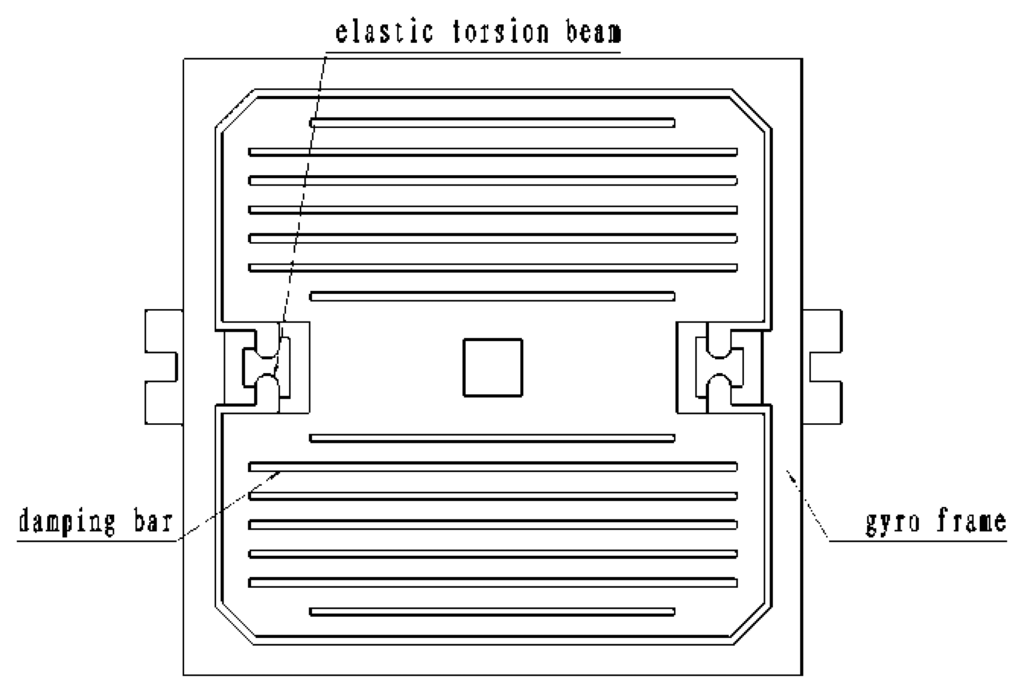 Figure 3 shows that elastic torsion beams are located on both ends of the constraint center of the silicon pendulum and they are fixed on the frame. Nitrogen is encapsulated between the electrode and the silicon pendulum. When the silicon pendulum is vibrating around the constraint center, the capacitance changes periodically. Then, by picking up the capacitance circuit, the gyro outputs a sensitive signal.