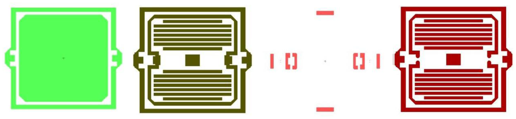 In the chip process, we have four steps. The first step shapes a movable section, the second step etches the damping bars, the next is buffer layer etching on the beams and the last step forms the silicon pendulum. The masks of the four steps and chip are shown in Figure 11.