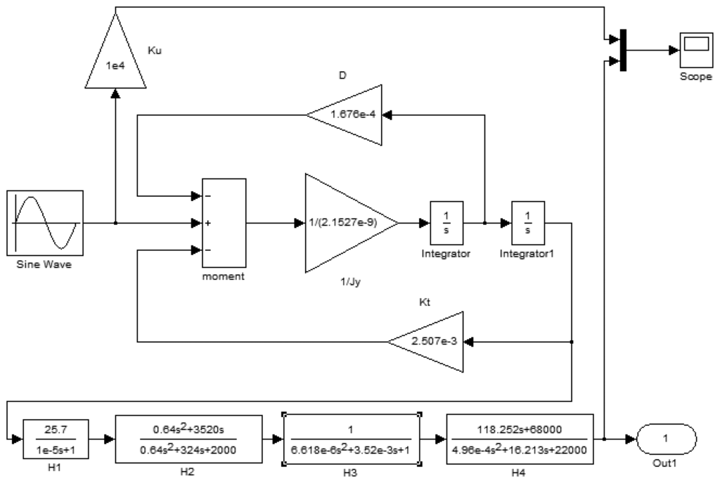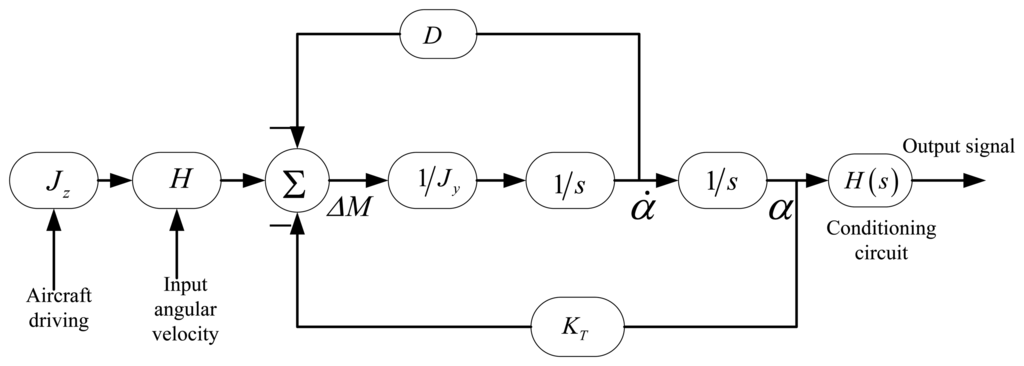 In Figure 16, an input periodic signal simulates the excitation of the second-order vibration system. The frequency of the periodic signal is the spin frequency of the aircraft. The constant transverse angular velocity is modulated on the sinusoidal wave amplitude. The second order vibration system is a closed loop system. Due to the vibration angular velocity of the silicon pendulum, the damping moment, which is formed by the damping factor D, feeds back to the input. Meanwhile, the torsion moment, which is formed by the torsion stiffness KT, also feeds back to the input. To summarize, the precession moment, damping moment and torsion moment together form a loop with negative feedback. There are two differential operators S in the loop model. The conditioning circuit models are located on the last step of the modeling.