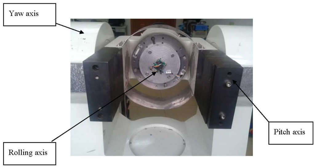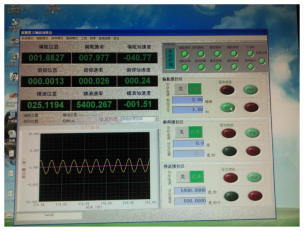 The gyro was installed on a MEMS three-axis precision turntable. Figure 18 shows the installation on the turntable. Figure 19 is the control table, and Figure 20 shows the working status.