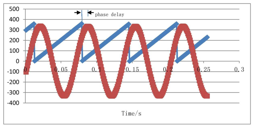 In order to compare to the simulation result as shown in Figure 17, we choose sampled data of φ = 15 Hz, Ω = 180°/s. Using these sampled data, we plot a curve, as shown in Figure 21. The blue line represents the turntable rolling axis angular displacement, while the red one represents the gyro output signal.