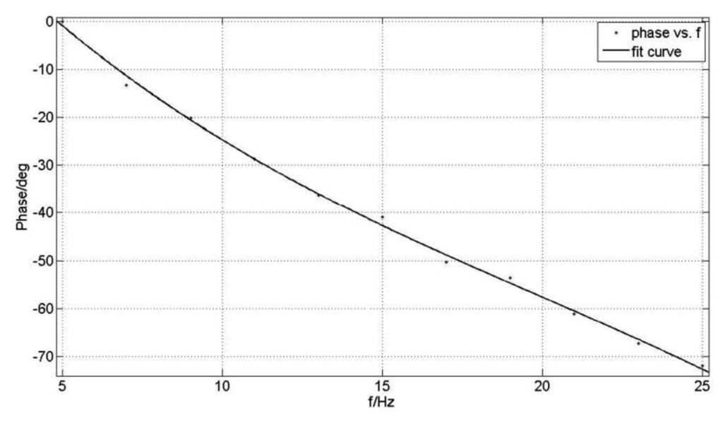 As shown in the Figure 21, the phase difference between the gyro output signal and driving reaches a value of 40.9°. Under the different rolling frequency, the calculated phase differences are recorded in Table 1. The fitting curve of the measured phase frequency characteristic is shown in Figure 22.