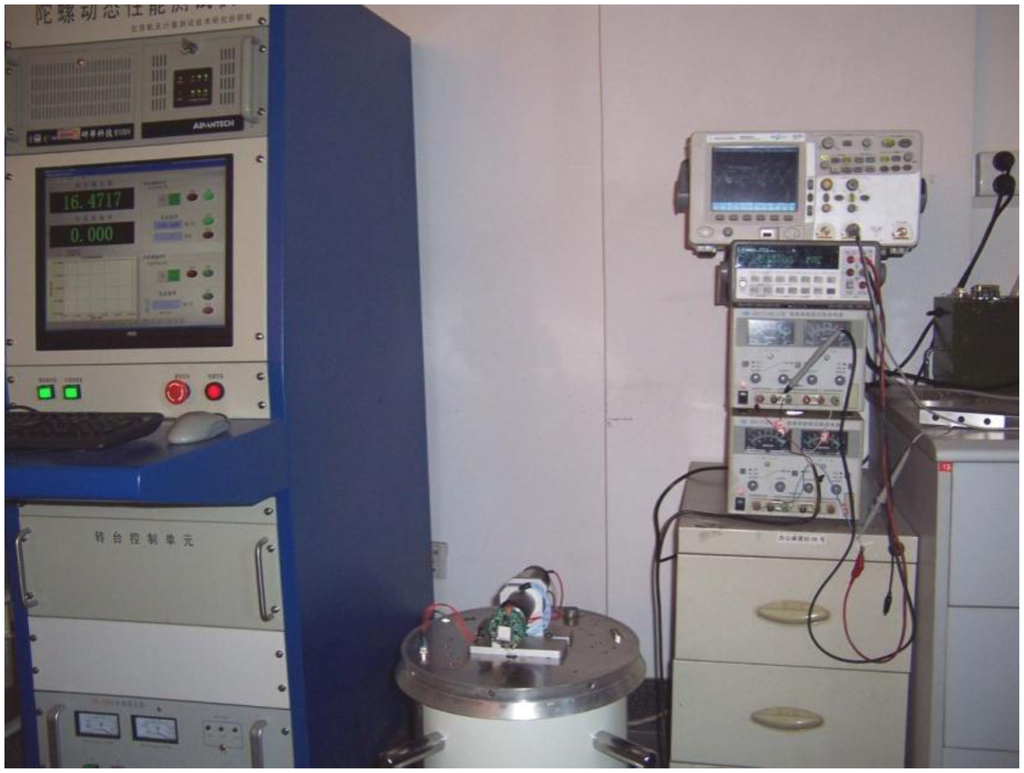 Angular momentum is same in the direction as the oz axis. If the aircraft turns with angular velocity of Ω around the input axis, the silicon pendulum will be forced to produce precession. Thus, along with the direction of precession oy axis, the precession moment acts upon silicon pendulum. The precession moment can be balanced with various moments such as the inertia moment, damping torque and elastic moment. Concerning these moments, because the silicon pendulum is vibrating around the precession axis, the angular acceleration generates inertia moment. Having angular velocity, the squeeze film resistance of nitrogen generates a damping torque, and the elastic torsion beam also generates elastic moment. In short, when aircraft undertakes a forced turn around the input axis ox, as a result, the silicon pendulum will generate precession to make angular momentum tend to the input transverse angular velocity Ω. The term α̇ represents the angular velocity of the silicon pendulum vibration. Suppose that the input angular velocity Ω is a constant, with the aircraft spin, the silicon pendulum will generate a simple harmonic vibration. After the detection circuit and conditioning circuit, the gyro will output a periodic voltage signal, as shown in Figure 5. A case is introduced to validate the correctness and applicability of the Si micromachined gyro driven by a rotating aircraft. The experimental platform is shown in Figure 6.