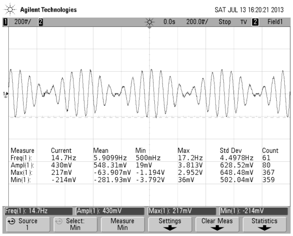 Figure 6 shows that the gyro was installed on an emulator and emulator was mounted on an angular vibration table. The spin angular velocity was given by the emulator and the value of the spin angular velocity had been adjusted to 5,400°/s (15 Hz). Input transverse angular velocity was provided by the angular vibration table and was inputted a constant value of 180°/s. The gyro's output signal was measured via a scope and the measured waveform is shown in Figure 7. If the aircraft is not rotating at a constant rate but rather a sinusoidal function with a frequency of 1 Hz, the gyro's output signal is a AM signal and the envelope of the signal corresponds to the sinusoidal function, as shown in Figure 8. The test control panel is shown in Figure 9.