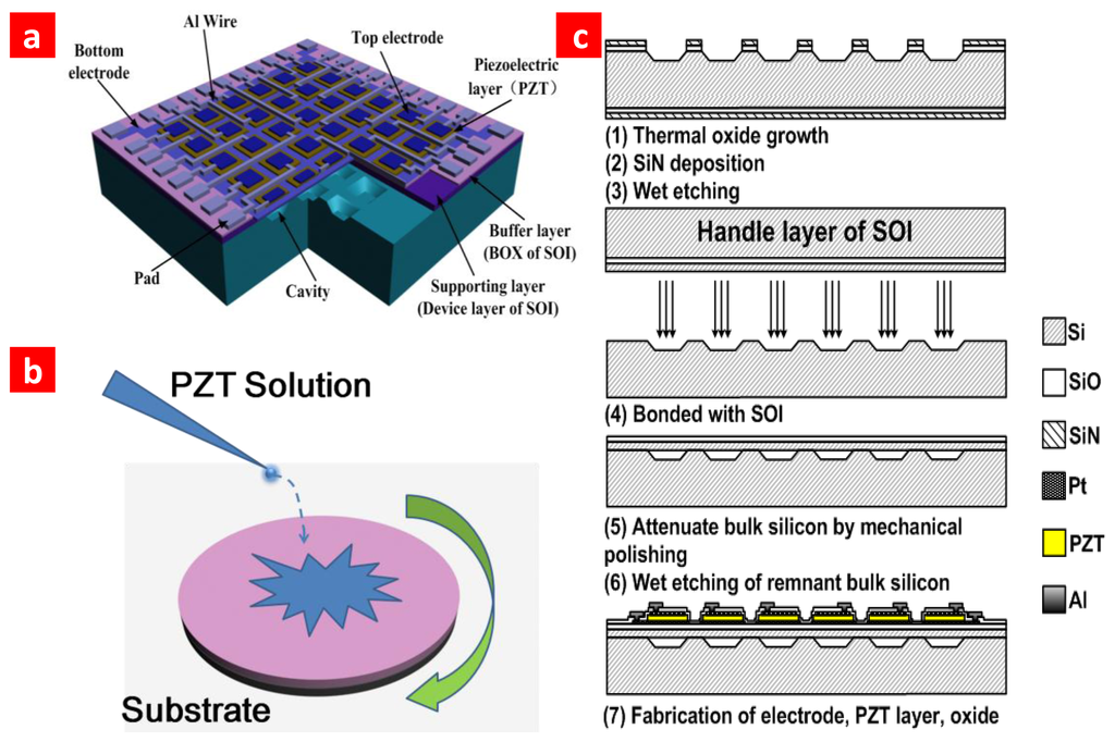 Figure 1a shows a pictorial diagram of our novel pMUT array. The piezoelectric layer is sandwiched between electrodes. A four-edge clamped membrane structure is designed to develop a high-frequency device. A schematic depiction of spin-coating PZT film is shown in Figure 1b. Thickness parameters of the structure are listed in Table 1. Each layer is estimated to be 100 nm. As previously reported, the 2 μm PZT film can be fabricated by layer-by-layer spin-coating PZT solution [15]. The fabrication process of the pMUT array is shown schematically in Figure 1c. First, high-density cavities were etched by potassium hydroxide (KOH) etching solution. Then the wafer was bonded to the device layer of SOI. To simplify fabrication and reduce residual stress, the Si wafer and SOI were bonded in atmosphere. The maximum temperature the wafer exposed in our process is 900 °C. We could use PT/PZT/PT structure to reduce the temperature to 600–700 °C [24]. This would make this technology compatible for IC integration.