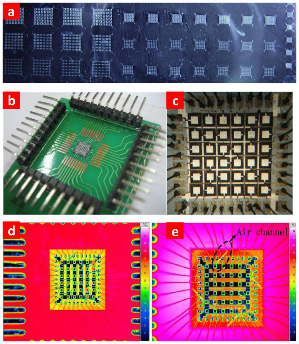 The wafer after SOI bonding is shown in Figure 2a. Photograph of the sample and full view of the high-density array are shown in Figure 2b,c. In order to avoid blowing up during annealing, an air channel structure was designed. To confirm that the air channel is complete and unblocked after fabrication, we used a thermal infrared imager (Image IR) to analyze the underneath structure. The thermal infrared image was captured by a Fluke Ti45. As the thermal conductivity of the air and silicon are different, we can see the air channel stretched to the edge in Figure 2d,e. From the infrared photos shown in Figure 2d,e, the air channel extends to the edge without blocking.