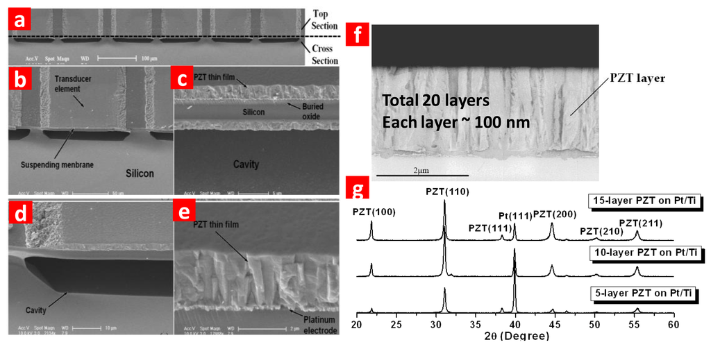 SEM photos in Figure 3a–e clearly show the element surface, the multi-layer structure and the ∼20 μm interspace. The fabricated transducers need to be poled before testing. Lead zirconium titanium (PZT) is used as piezoelectric layer. As transduction layer, thicker PZT brings enhanced driving capability to the device and improved sensitivity. SEM photo and XRD result of the PZT film prepared by an optimized sol-gel method are shown in Figure 3f,g.