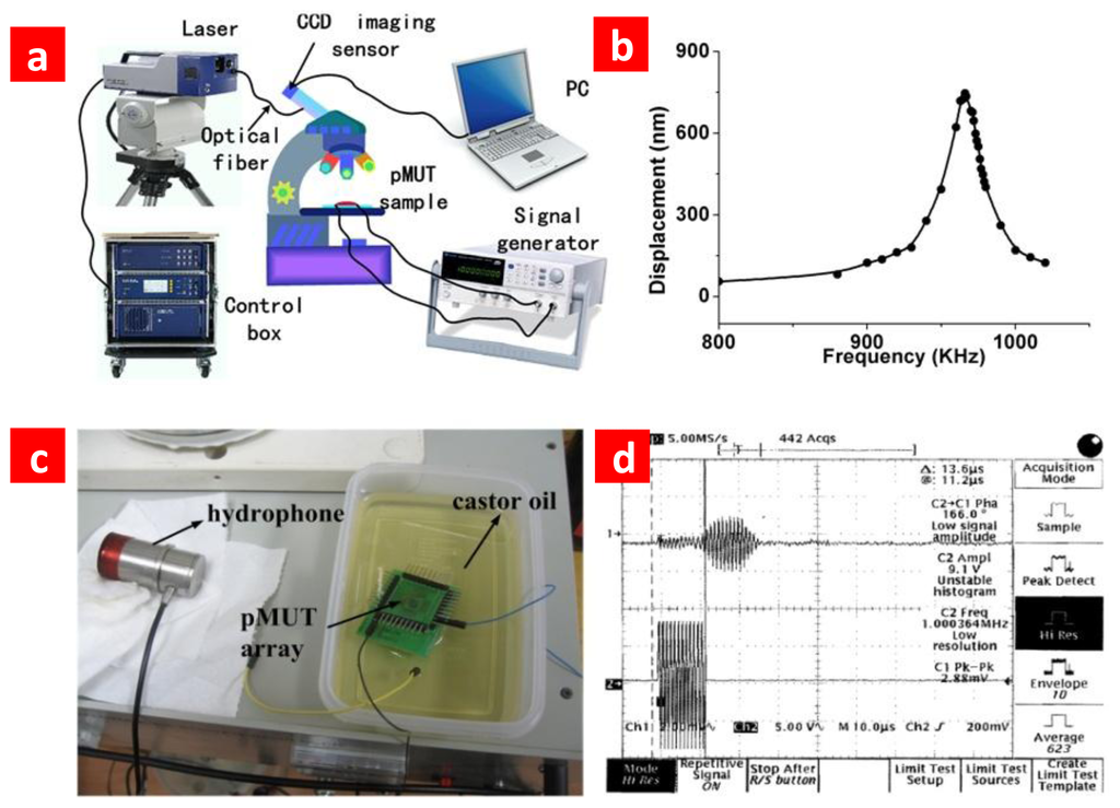 We used a laser vibrometer (Polytec PSV-400) to directly observe the acoustic characteristic of the fabricated arrays, as shown in Figure 4a. Vibration under different signal stimulus is shown in Figure 4b. The resonance frequency acquired by vibration test is well consistent with the result of the impedance analysis. In order to reduce the crosstalk we took some special precautions during the designing of the pMUT array. The PZT was etched to separate each independent element. As a result, according to the vibration testing results the crosstalk between adjacent elements can be neglected. The cross talk is no more than the environment noise, and the SNR of the device while operated under 4 V voltage is about 43 dB. The bandwidth of PMUT with element size 200 × 200 μm2 is 50 kHz, which could be estimated through vibration results in Figure 4b. We also tested the functionality of the fabricated pMUT array in a liquid environment, and the experiment set and test result is shown in Figure 4c,d. The resulta show that it can work well under castor oil.