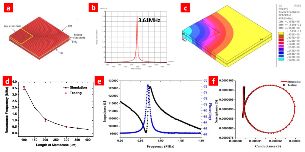 The thickness of each layer is modeled by the finite element method (FEM) to make a trade-off between transmitting ultrasonic pressure and receiving sensitivity. Element size is used to achieve different resonance frequencies. The FEM model and harmonic analysis of a pMUT element with element size 100 μm × 100 μm are shown in Figure 5a,b. The vibration amplitude of the PZT film is shown in Figure 5c. Capacitances of elements with different size are listed in Table 2. Their capacitances are considerably high compared with that of bulk ceramic transducer which are normally less than 10 pF. Impedance analysis is used to measure the resonance frequency (fr) of transducer. Impedance spectrum is shown in Figure 5d,e. The fr is around 1 to 3.6 MHz and can meet the requirement of medical imaging application well [25]. The experimental results fit well with the simulation as Figure 5f shows. Coupling coefficient keff and quality factor Q can be extracted by equivalent circuit. The fabricated pMUT have relatively high keff and Q. The PZT Stiffness coefficient and piezoelectric matrix parameter are listed in Table 3. The main parameters used in the simulation are listed in Table 4.