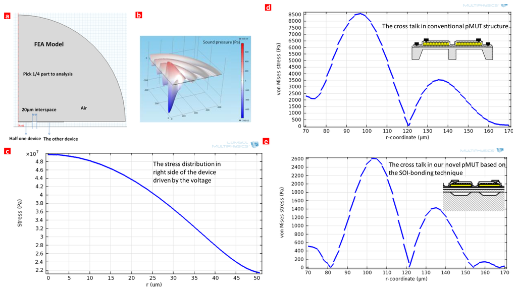 The cross-talk effect is simulated theoretically. Figure 6 shows a numerical simulation of the cross talk effect in pMUT. Figure 6a shows a FEA model for the cross talk in the pMUTs. The left one is driven by the voltage to see the stress distribution in the other device. If the stress in the left one device is quite low compared with the right device, we can conclude that the cross talk is minimized. A quarter is enough due to the symmetry of the structure. Figure 6b shows the sound pressure distribution in the air. Figure 6c shows the stress distribution in the left half one device with maximum stress up to 5 × 107 Pa. Figure 6d shows the cross talk of the conventional pMUT structure with maximum stress to 8.5 × 103 Pa. As shown in Figure 6e, the cross talk of our novel pMUT structure with maximum stress was just 2.6 × 103 Pa. Compared to the conventional device, the cross talk effect is reduced more than 3-fold by this design.