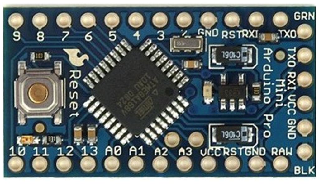 Arduino Mini of 3.3 V (Figure 1) was chosen, due to its dimensions and its facility to be integrated in the shoe.