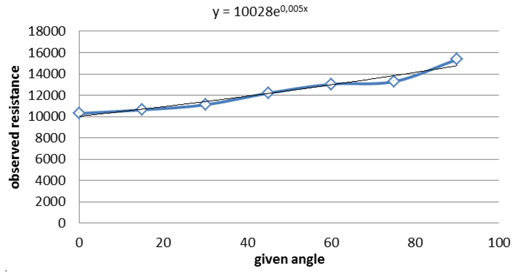 From the equation, the angle depending on the resistance can be deduced. The angle of the sensor, deduced from Figure 10, presents the following equation: