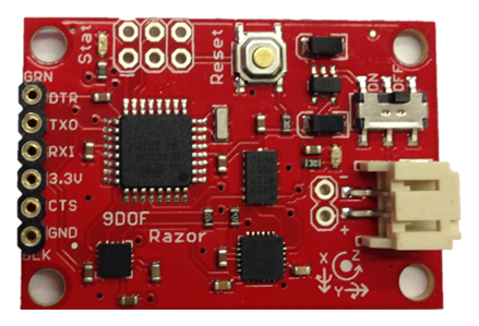 Although, in this first study, only the pressure and the angles are measured, this first prototype includes one accelerometer for their posterior treatment. The chosen device is the Inertial Measurement Unit (IMU) Razor 9 DOF (see Figure 12). It contains three ac-celerometers, three gyroscopes and three magnetometers. The literature shows different gait studies that integrate accelerometers and gyroscopes [21–23]. They can also be used as pedometers [24]; thus, existing studies compare these two devices [25]. A review of the accelerometers on wearable systems is showed in [26].
