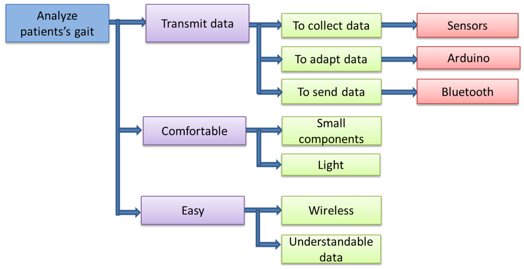 The first of the three main functions is to transmit the data. To achieve this, the device has to fulfill three smaller functions, which are: to collect, analyze and adapt the data and to send them. The second main function is not to disturb the patient's gait, which means that it must be light and have the smallest components as possible. The third function is to be easy in terms of use. For this reason, the device must be wireless, in such a way that the patient can use it anywhere. Moreover, the device must be easy to use by a doctor. Hence, the final data must be presented in curves or figures that can be easily understandable.