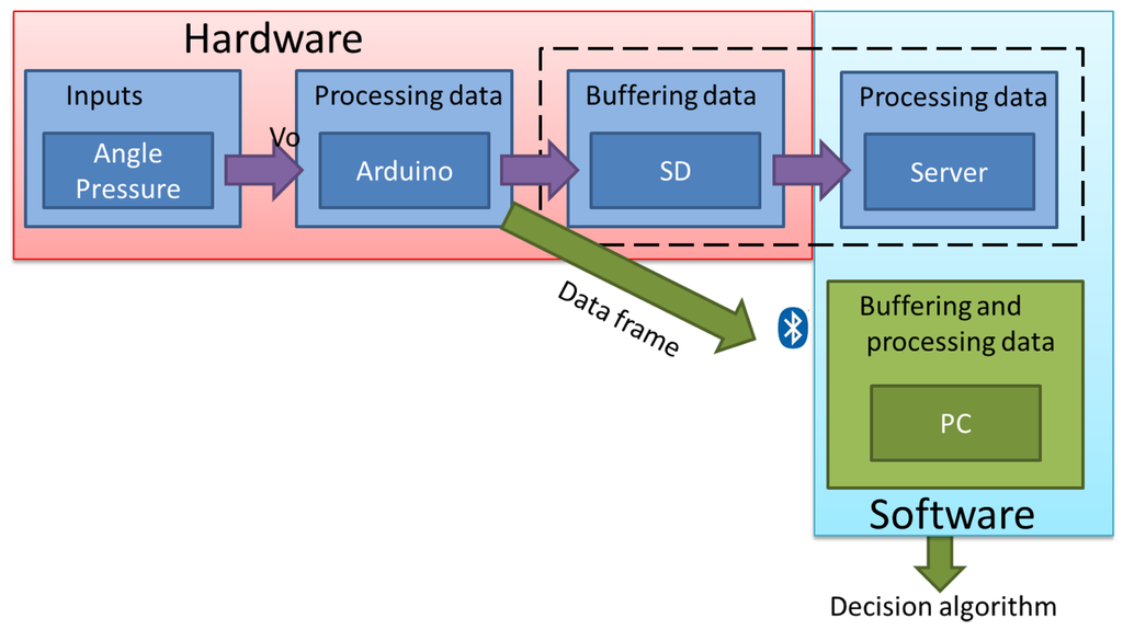 In this first study, the data are stored on a PC directly in order to obtain a decision algorithm. The final device will store the data on a micro SD for their subsequent treatment in a server. This also means that the final prototype will not include a Bluetooth module, aimed at making the storage of data more reliable.