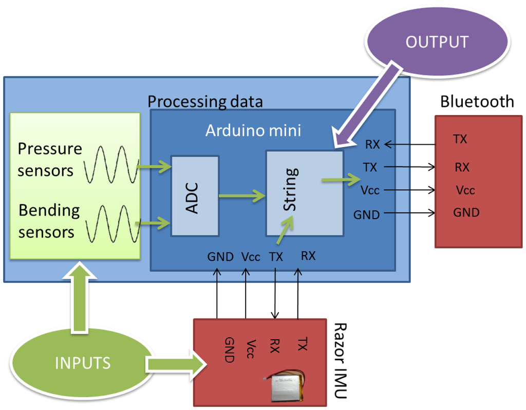 The schemes of the two blocks with processing stages are shown in Figures 17 and 18. The communication between the Bluetooth and Arduino is done by serial port. Two of the digital pins are used as RX and TX, the receiver transmitter lines for the communication.