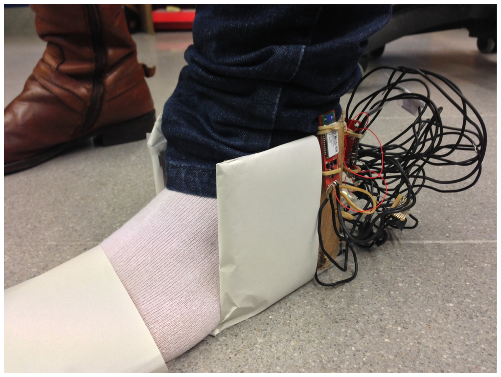 The placement of the different sensors was changed for each user, taking into account that the pressure sensors are placed under the first and fifth metatarsal and under the heel. The sole sensors are covered for more comfortability for the users.