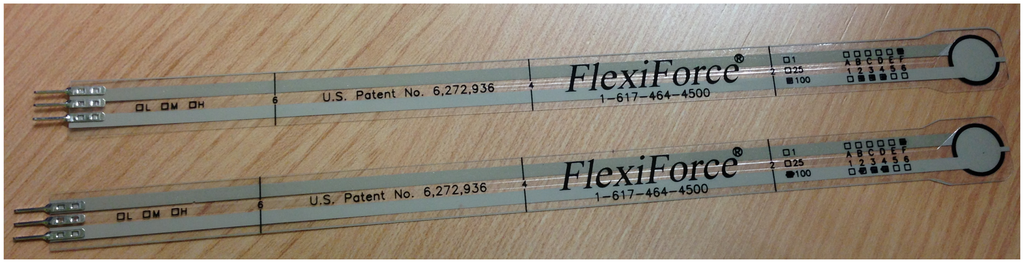 The prototype integrates Flexiforce pressure sensors of 100 lbs (see Figure 2). These sensors were used in previous studies [18]. Zhang et al. [19] developed a plantar system to know the pressure made by the user, and they also including an explanation of the technical features.
