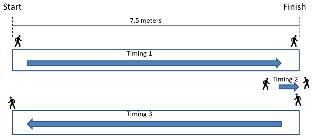 Third test, Figure 20: The person walks 7.5 m and then back again another 7.5 m. The person is asked to walk normally. At the same time, there is a timing of the three different stages of the test: the first 7.5 m, the time the patient takes to turn around, and the second 7.5 m.