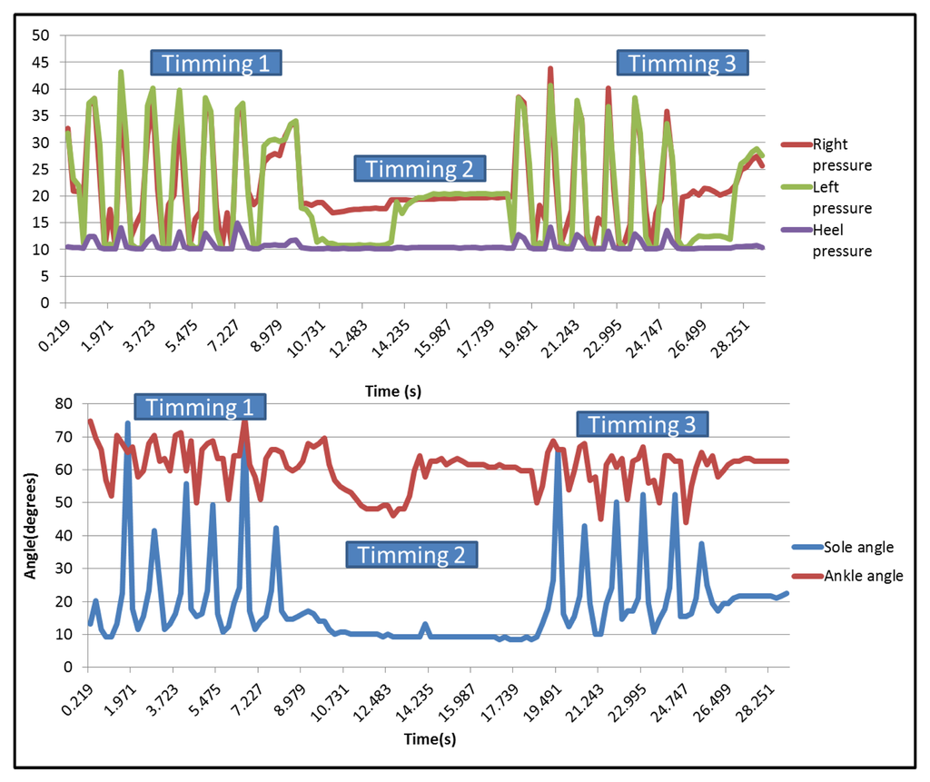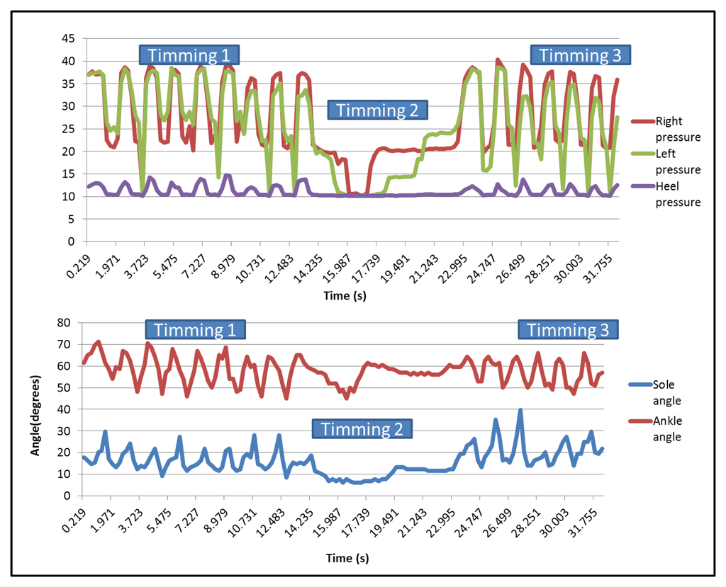 In this case, for the established thresholds, Table 7 presents less accuracy than the angle sensors; Table 4; 86%p in the right pressure sensor (the one which presents worst results) and 93% for the left sensor. However, the heel pressure accuracy is 100%, the same as the angle accuracy.