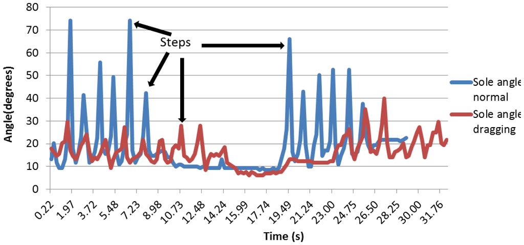 As far as a healthy person is concerned, if the standard deviation of the sole angle is lower than 8.5, then this person is dragging a foot. This indicator will need to be tested with a future prototype and with diabetic patients or patients with sclerosis or Parkinson to be really reliable.