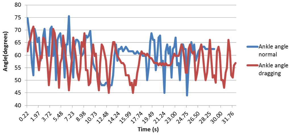Regarding the sole angle, it was different for each person, as the foot was not perfectly maintained; thus, it appears that the data are difficult to be compared qualitatively. Figure 24 shows that there is less difference between the normal and dragging peaks.