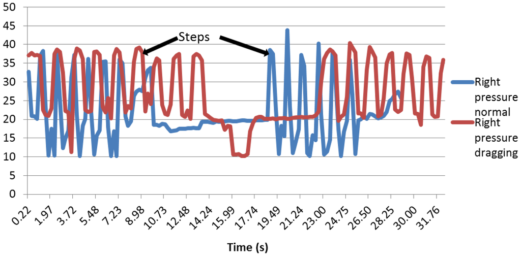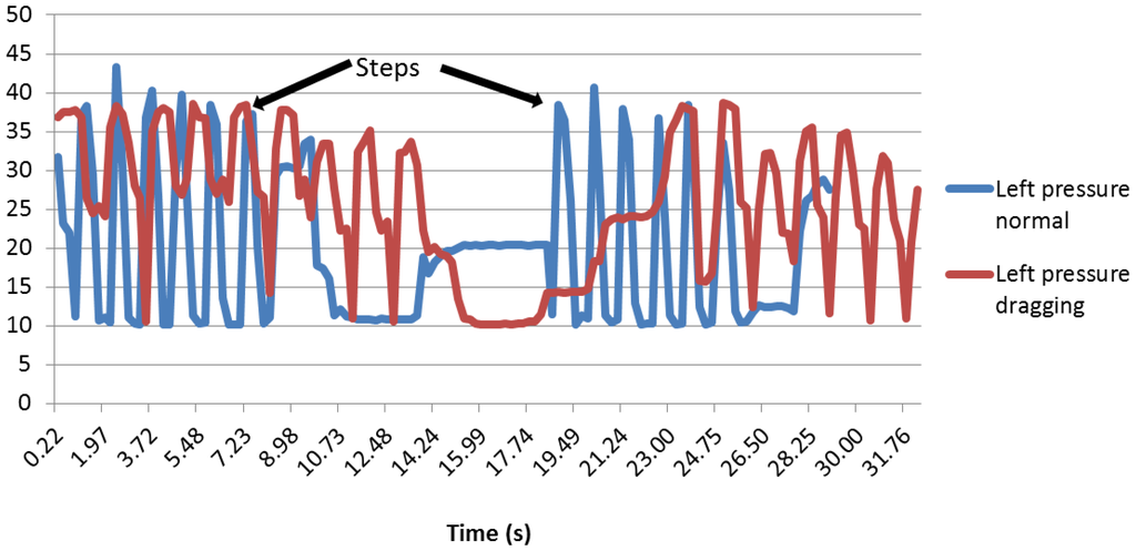 In this case, the minimum peaks of the right sensor are higher than the graph in Figure 21. During normal walking, the value of them was over 10 (near the heel sensors values), but when dragging a foot, the minimum values were over 20, except for the part in which the user stops to change his position.