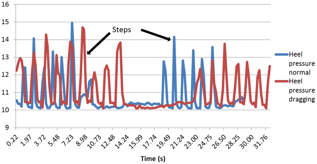 The present study does not distinguish the different stages of the gait, but it differentiates between normal gait and dragging a foot with high accuracy. In [27], the authors verify their system based on three pressure sensors and a gyroscope with people with a normal gait and those with a pathological gait. The obtained results show accuracy around 99%, distinguishing the four phases of the gait: stance, heel-off, swing and heel strike. Bae et al. [28] presented a system based in ground reaction forces (GRF) to improve the gait quality in patients suffering from Parkinson disease.