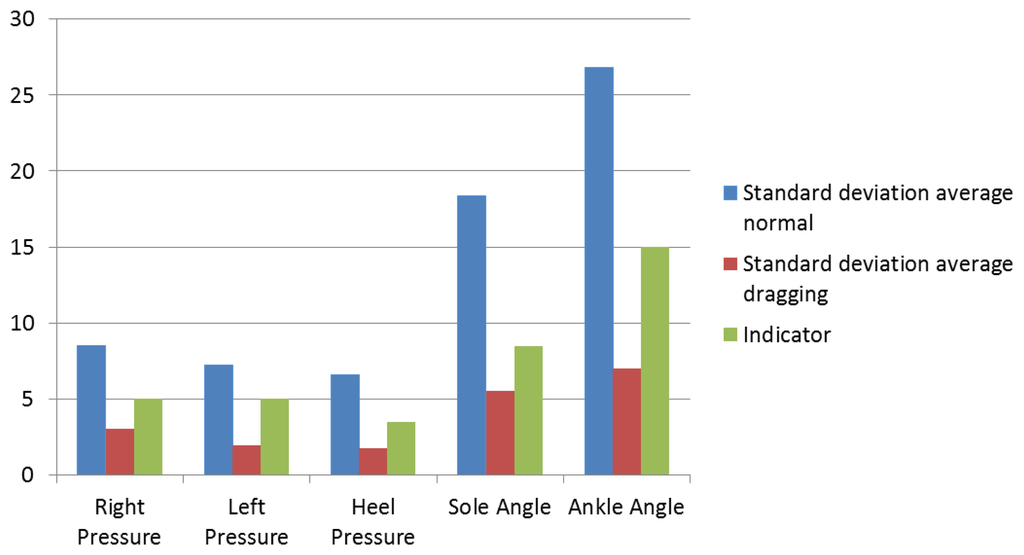 Regarding the right pressure sensor, it can be seen that most of the standard deviation values are superior to five when the patient is walking normally and inferior to it when dragging.