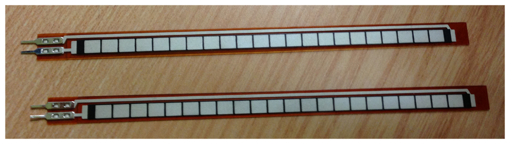Bending sensors see that their electrical resistance changes when they are bent. They are flexible sensors that are resistive, as well. In fact, when they are bent, the material composing them is stretched, so the current going through it has a longer way to go. When the sensor is bent, the sensor resistance rises, depending on the angle. In [20], Kappel et al. present a strain sensor, based on PolyPower, which measures the strain between two points.