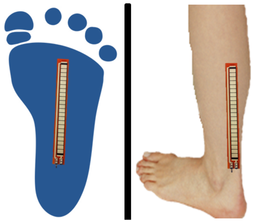The bending sensor placed in the shoe sole (see Figure 6) detects the plantar and the dorsal flexion when the user walks. The first of the movements increases the angle between the frontal part of the foot and the tibia, whereas the dorsal flexion is the inverse movement: it decreases the angle, the foot approaching the tibia.