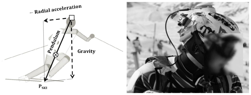 Typical errors for dGNSS systems are 10 mm ± 1 ppm in horizontal and 20 mm ± 1 ppm in vertical direction [9]. The dGNSS head trajectory (PdGNSS) was filtered with a cubic spline function weighting each 3D position with its accuracy estimate from the differential position solution [5]. The tolerance factor (lambda) was 0.5 for the horizontal and 0.7 for the vertical component. For the approximation of the CoM based on the trajectory of the dGNSS antenna, the biomechanical phenomenon that skiers incline laterally in order to balance the radial force during the turn was used. The skier's inclination was modeled by an inverted pendulum [9,23] which was attached to the dGNSS antenna. The neutral position of the pendulum was given by the normal projection of the dGNSS antenna onto the snow surface. The pendulum was in neutral position during straight skiing, when the radial acceleration was zero. During turning the pendulum was deflected from its neutral position. The deflection representing the skier's lateral tilt was calculated as a linear combination of the gravitational and the dGNSS antenna radial acceleration. The intersection of the pendulum vector with the snow surface yielded the ski position (PSKI). Finally, the approximation of the CoM (CoMdGNSS) was modeled at 53% of the pendulum length measured from the dGNSS antenna (Figure 2). The computation of the CoMdGNSS at 53% of the pendulum length was determined on a full body segment kinematic dataset [2]. CoMdGNSS was low-pass filtered (second-order Butterworth filter; cut-off frequency of 4 Hz). Instantaneous CoM velocity (vdGNSS) and acceleration (adGNSS) were computed as the first and second time derivatives using the finite central difference formulae [24]. The pendulum model was described in detail in [25].
