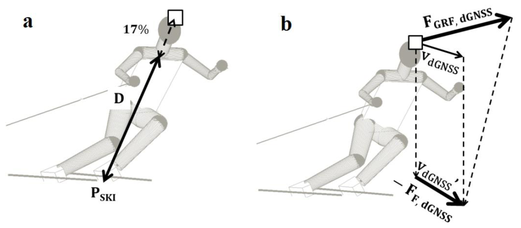 The current study proposed a new approach for the reconstruction of the external forces acting on alpine skiers using a dGNSS-based method. Compared to previous dGNSS-based force modeling [9] the dGNSS antenna was mounted on the helmet instead of the back. The dGNSS method was compared to a kinetic reference system constructed from a video-based 3D kinematic segment model, allowing precise reconstruction of center of mass and air drag. Among the field methods applied to determine air drag in alpine skiing [2,9,14,15,17,27], [15] was chosen as the reference system, since this model most probably accounts best for the different body positions, speed and clothing in giant slalom skiing. The reference system allowed a precise reconstruction of the CoM (mean error 23 mm, SD 10 mm) and thus the resultant force acting on the CoM [33].