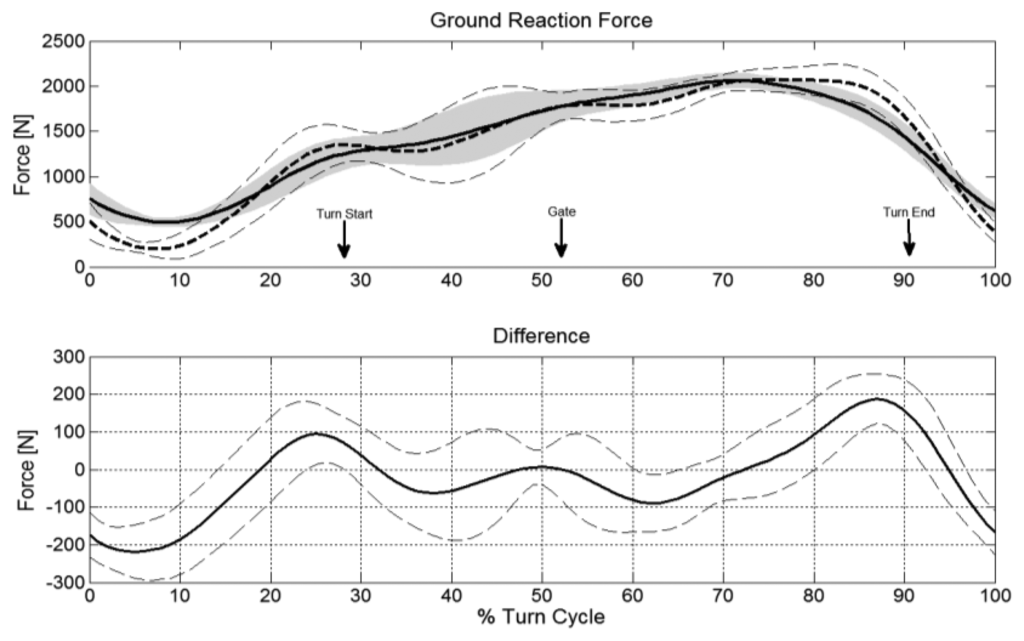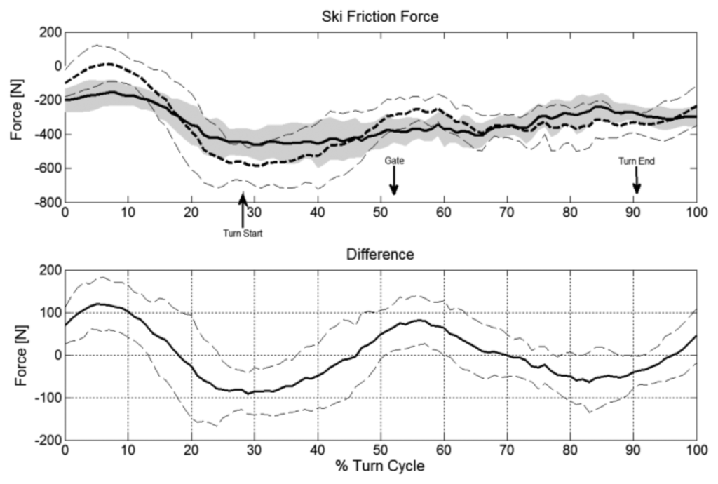 Because the instantaneous vectorial difference patterns were repeatable for the twelve trials, the AVD-Within-SDs were relatively small: smaller than the AVD-Offset-Between-SDs for FGRF and FF but about equal for FD. The AVD-Offset-SDs describe the precision within the dGNSS method and therefore apply for relative comparisons between skiers or turns when both components are determined with the dGNSS method. In a study investigating slalom skiing [2] it was found that the ground reaction force was 253 N higher at gate passage on a course with a 10 m gate distance compared to a course with a 13 m gate distance. The AVD-Within-SD of the dGNSS method for FGRF was 63 N and thus the dGNSS method is valid to identify such discriminative meaningful changes for the ground reaction force. Similarly the air drag was increased, at 15 N at gate passage in the 13 m course [2], while the AVD-Within-SD for FD was 7 N. As long as the AVD-Within-SD's are smaller than the differences to be investigated, the method is valid for identifying discriminative meaningful changes at random instances in a turn cycle.