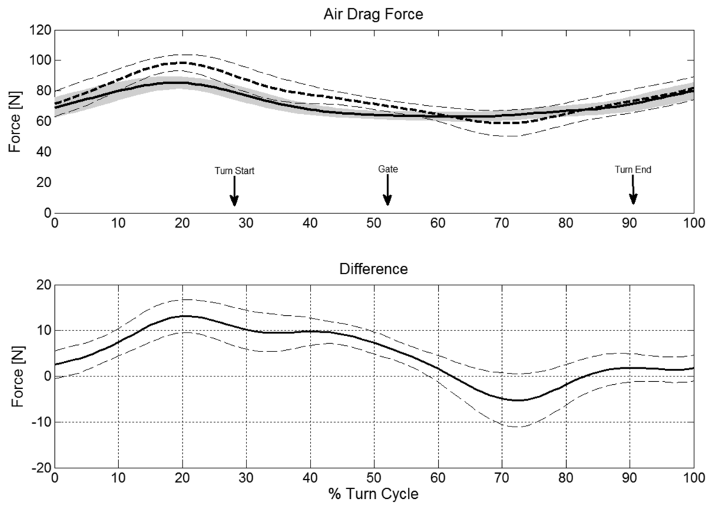 The dGNSS method underestimated the turn cycle maxima of all three forces. However, the offset and SD were acceptable with respect to the size of the maximal ground reaction forces [34,35]. Air drag might be maximal in the initiation phase of the turn (Figure 6), when skiers are in a relatively extended body position [2,36]. It is likely that skiers had their arms abducted in that phase of the turn cycle and that these contributed to FD. The underestimation of both maximum and AVD-offset in that phase of the turn may thus partly be caused by the lack of inclusion of the arms in the dGNSS method.